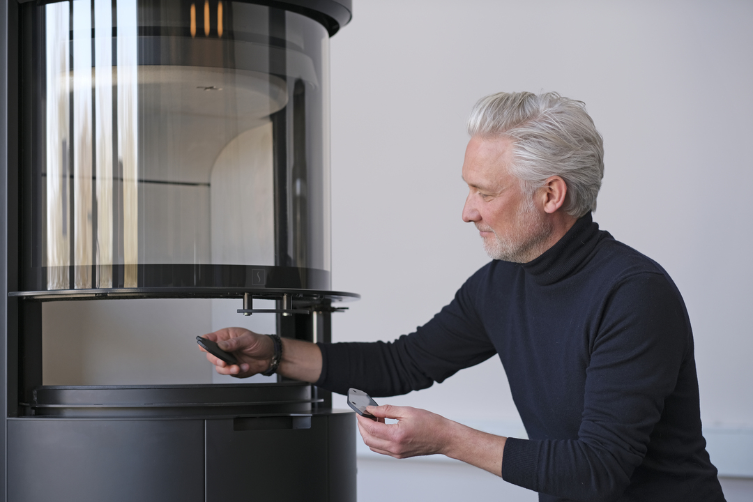 Laissez-vous séduire par sa porte galbée escamotable offrant une vue panoramique sur les flammes à 160° ! À la fois esthétique et fonctionnel, il est doté d’une poignée froide en verre élégamment intégrée au galbe de la porte, de commandes d’arrivée d’air élégantes et intuitives et d’un cendrier intégré. Il s’impose comme un véritable meuble chauffant à placer au centre de la pièce !